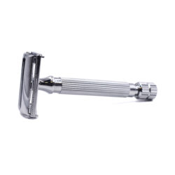 Parker Safety Razor 82R är en klassisk rakhyvel i förkromad mässing och ger ett stadigt grepp med det räfflade handtaget. Utrustad med en butterflyöppning blir det enkelt och smidigt att byta blad genom att skruva på hyvelns bottendel så att rakhuvudet öppnar sig för isättning av bladet. Huvudet sluter sig därefter när du skruvar tillbaka bottendelen.